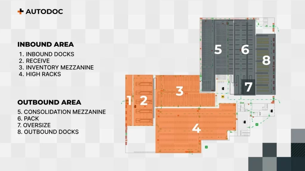 Let’s start by identifying the two most important divisions of the warehouse zone. These are the INBOUND area, which includes the areas and processes of receiving and unpacking goods, entering them into the system and storing them, and the OUTBOUND area, which includes the areas for picking all the items included in one order, packing products into shipping boxes, sorting packages, loading them into containers, and shipping parcels from the warehouse.